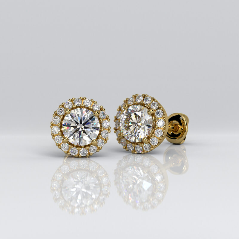 The Halo Earrings combine timeless brilliance with modern craftsmanship. Featuring a classic circular halo design, each earring is set with 15 accent stones (1.7mm each) that enhance the fire and sparkle of the central stone. Choose between a 4.5mm or 6mm center stone to suit your style.